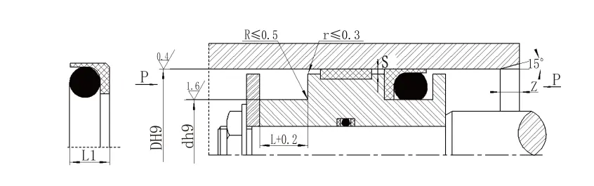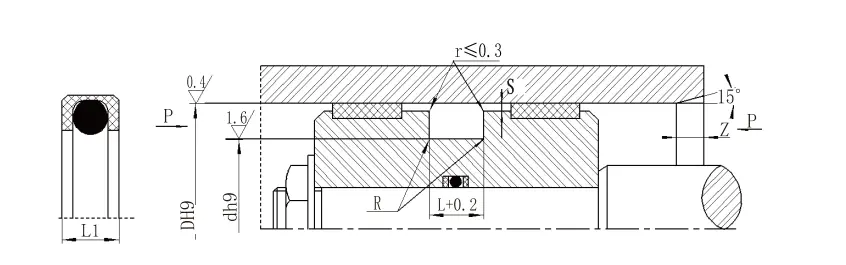 Gama de deschidere D H9 | Diametrul canelurii D H9 | Lățimea canelurii L+0.2 | Înălțimea de sigiliu L1 | Colțuri rotunde RMAX | Clearance radial sMax | Chamfer Z.min | Diametrul sârmei cu inel O. D.O | |