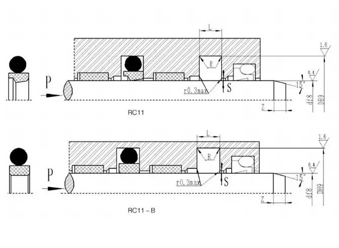 RC11-B este compus dintr-un inel de etanșare dreptunghiular PTFE umplut și un inel de cauciuc în formă de O, potrivit pentru etanșarea presiunii în două sensuri a mișcării reciproce hidraulice. Ringul O oferă forță radială și compensează uzura inelului de etanșare. În general, este utilizat împreună cu un inel de ghidare. Canelurile împărțite (deschise) trebuie utilizate pentru diametrele tijei mai mici de 30 mm. Caracteristici: