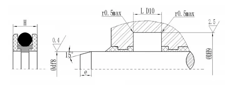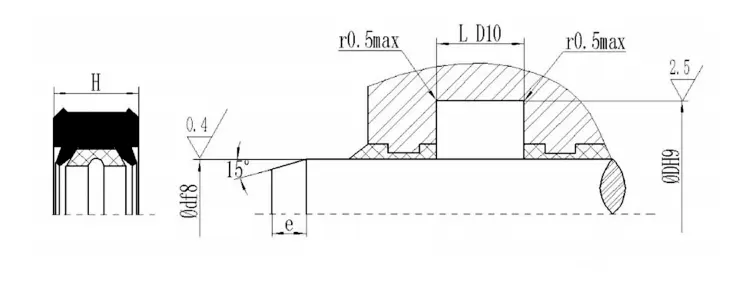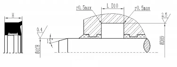 | Diametrul tijei df8 | Groove Diametru exterior DH9 | Lățimea slotului L D10 | Înălțimea de sigiliu H |