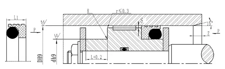 Diametrul arborelui Standard D f8 RC2061 | Diametrul arborelui Tip greu D f8 RC2061-Z | Diametrul canelurii D H9 | Lățimea canelurii L+0.2 | Lățimea sigiliului L1 | Colțuri rotunde RMAX | Clearance radial SMax | Chamfer Zmin | Diametrul sârmei cu inel O. | ||
